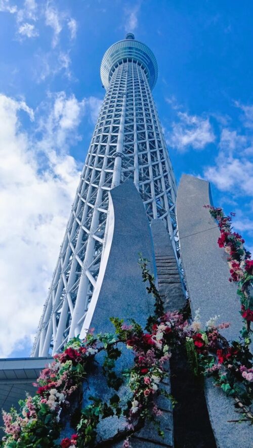 園内を一通り歩いた後は、そのまま散歩がてらスカイツリー方面へ向かいました。ベンチに座って、先ほどSEISUIで買ったパンで昼食にしました。空を見上げるとスカイツリーが大きくそびえ立っていて、近すぎててっぺんまで見えないのもまた一興です(笑)。鉄筋の白さと、青い空がいい感じでした。観光地ながらも、意外と静かな場所があり、ゆったりしたランチタイムを楽しめたのも良かったです。