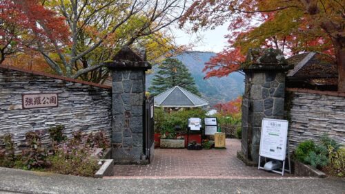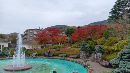 初日はあいにくのくもりでしたが、紅葉は見ごろで美しく、しっとりとした雰囲気の赤や黄色を楽しむことができました。まず訪れた強羅公園は、温室が広くて見応えがあり、噴水のある庭園もとてもきれいです。特に、大木の間に苔むした岩がゴロゴロと転がる独特の景観が印象的で、美しさと迫力が同居しているのが良かったです。ほかの公園とは違う、野性味ある雰囲気が素敵でした。
