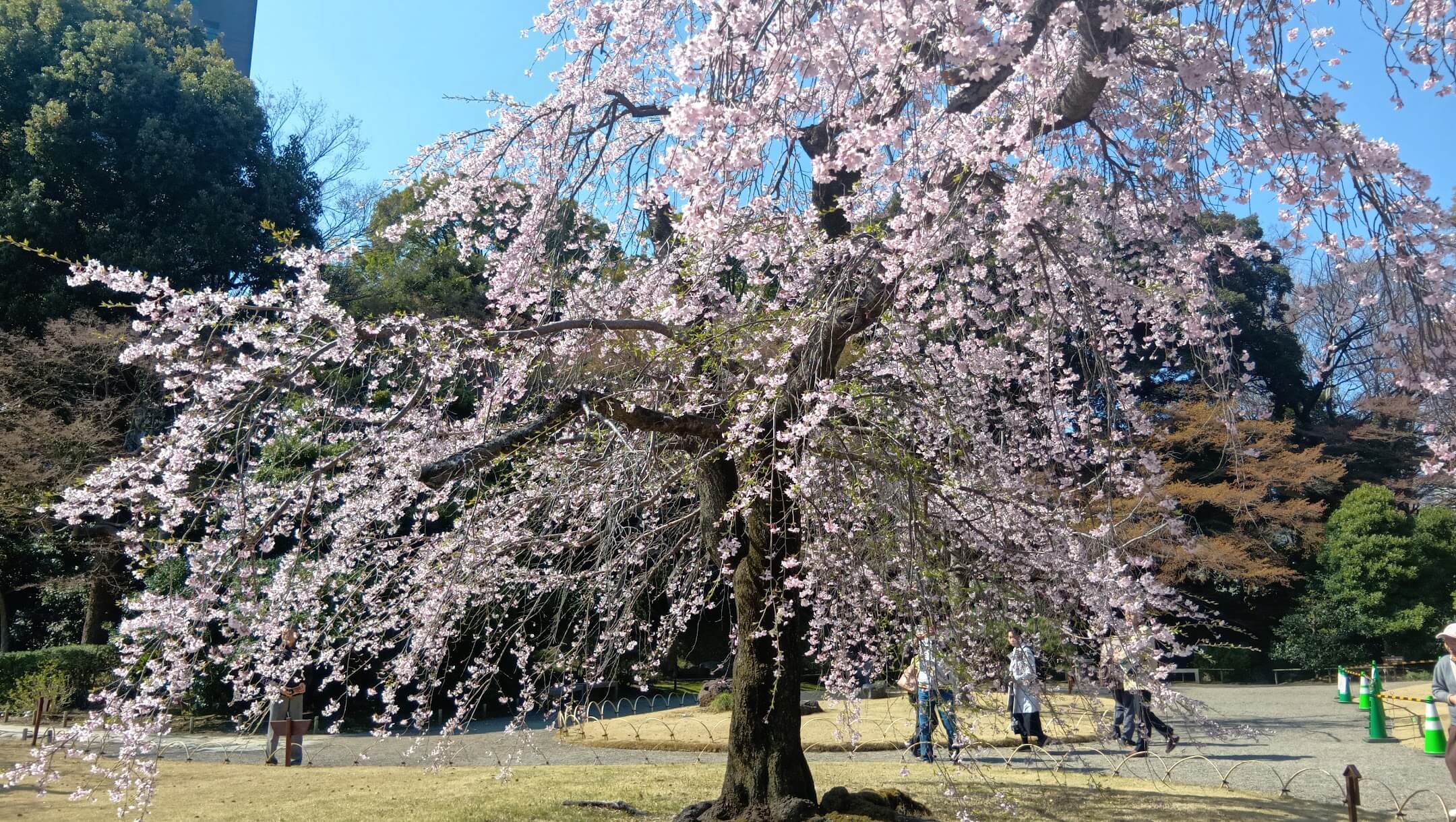 シダレザクラが見頃と聞いて、小石川後楽園へ行ってきました。訪れたのは、西門近くにある有名なシダレザクラ「馬場桜(ばばざくら)」です。