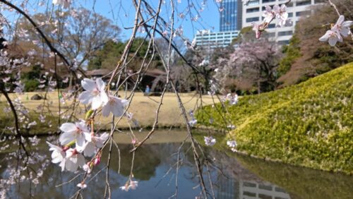 小石川後楽園のしだれ桜は、落ち着いた庭園の雰囲気の中でゆっくり眺められるのが魅力です。見る向きによって、池が背景になったり、建物が背景になったりして、いろいろな表情が楽しめるのも素敵でした。