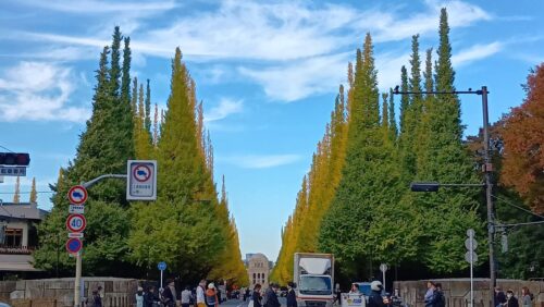 秋の晴れた日、東京の紅葉名所として人気の銀杏並木を巡ってきました。まずは原宿駅からスタート。代々木公園のイチョウ並木を歩くと、青空に向かって伸びる木々が少しずつ黄金色に変わり始めていて、秋の深まりを感じました。葉の間からのぞく青空と、鮮やかな黄色のコントラストが本当にきれいでした。