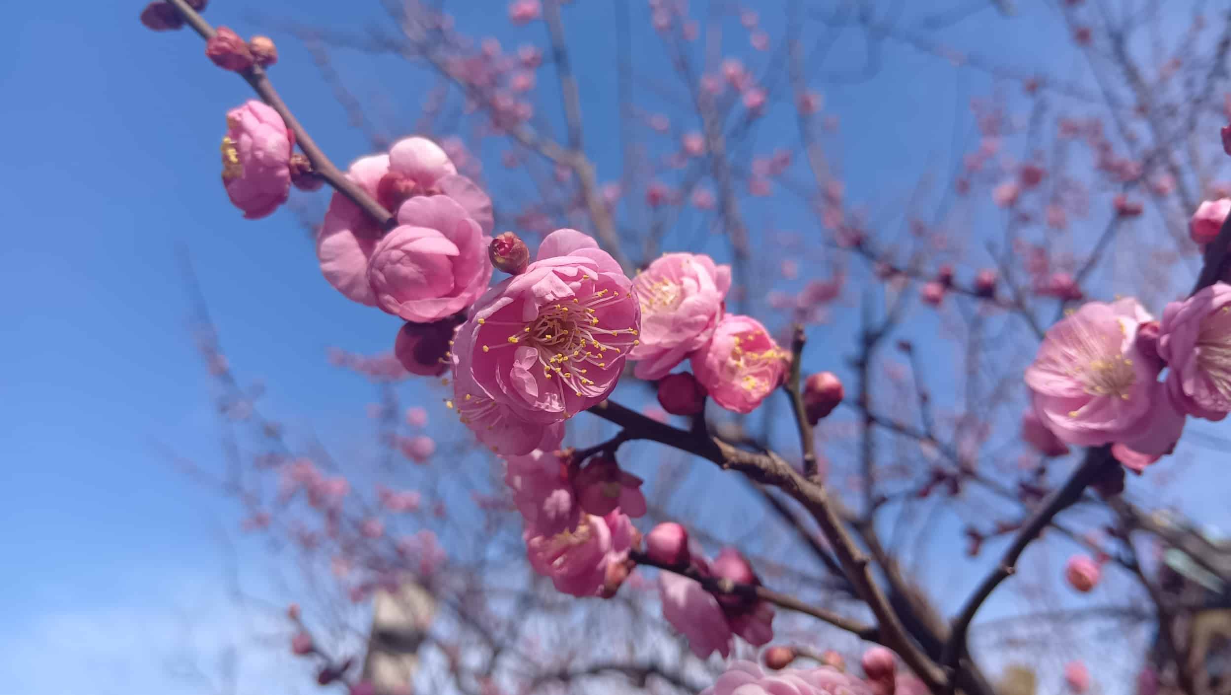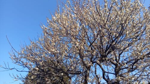 境内では梅が咲いていましたが、早咲きの梅が2、3本ほどでした。満開ではありませんが、枝のあちこちに濃い色の花が見えます。梅の花はぷっくり丸いので、淡い色よりも濃い色の花の方が、花の形がくっきりしていて綺麗に見える気がします。かわいらしいです。