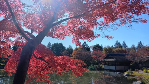 また、日本庭園の紅葉も見どころでした。日当たり具合によって色づきが異なり、鮮やかな赤や深みのある橙、まだ少し青みを残した葉まで、自然がつくり出すグラデーションがとても綺麗でした。池に映る紅葉も心が落ち着く風景で、しばらく眺めていました。